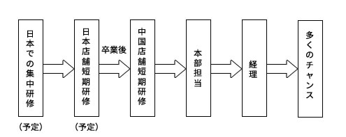 なぜ、店舗の研修を最初に行いますか。ビジネスの原点は現場にあるからです。店舗への理解を深めるために、本部に来る前に店舗の研修を受けることが必要です。研修後、個人の要望と会社の要求に基づき、商品部、店舗サポート部、宣伝販促部、店舗開発部、総務人事部、財務部、物流・システム部といった本部各部門に配属し、様々な業務にチャレンジしていただきます。